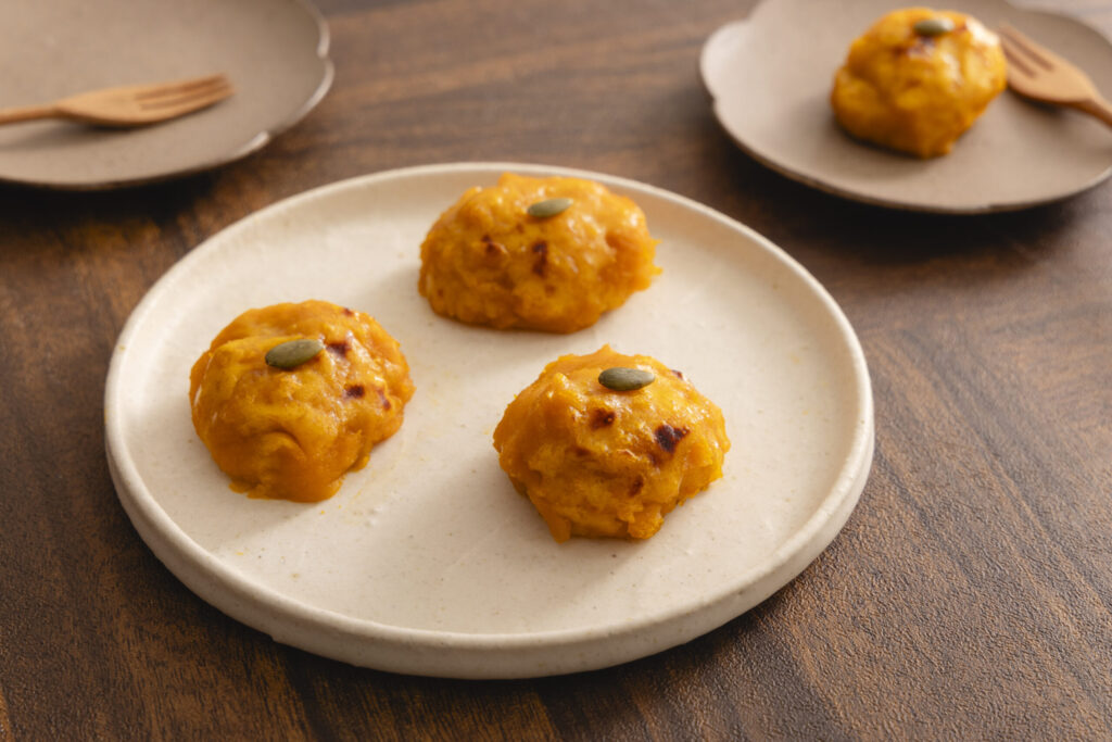 - かぼちゃは皮をむいて一口大に切り、耐熱ボウルに入れて水 大さじ1(分量外)を加える。ラップをして電子レンジ(600W)で3分加熱し、水気をきって熱いうちに潰す。