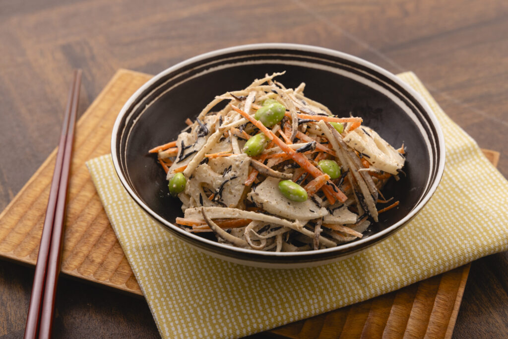 - ごぼう、にんじんは細切りに、れんこんは薄いいちょう切りにする。ひじきは水で戻す。枝豆は解凍する。
