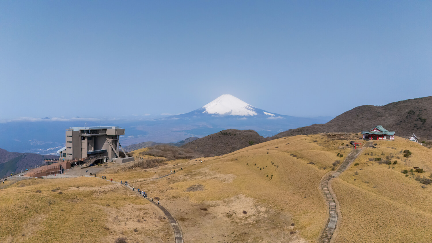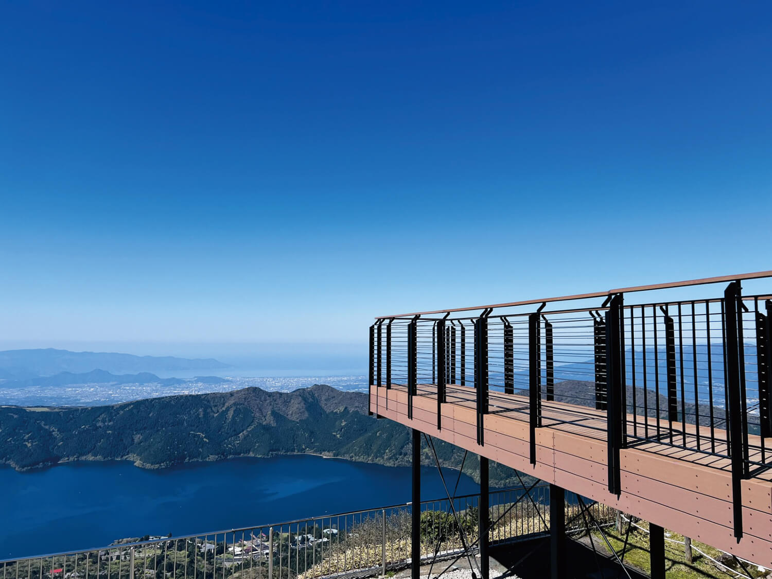 2025年4月にリニューアルした箱根駒ヶ岳ロープウェーは、箱根園から駒ヶ岳の山頂まで全長1,783ⅿ、片道約7分間の空中散歩が楽しめます。山頂駅舎を出ると約400㎡の展望デッキ「芦ノソラ」が広がります。眼下に芦ノ湖と外輪山、その外側に広がる富士山や駿河湾の景色をゆったりと眺めることができ、突き出しデッキではさらに浮遊感を味わう景観体験ができます。