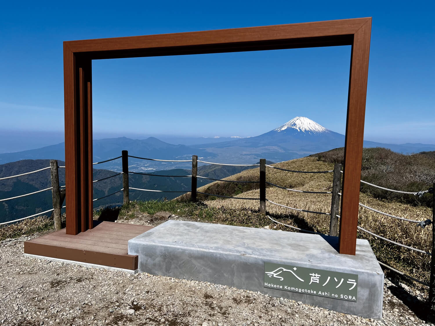 巨大フォトフレーム『富士ノガク』で、富士山の美しい稜線が麓まで広がる雄大な景観とともに、旅の思い出となる写真を撮ることができます。