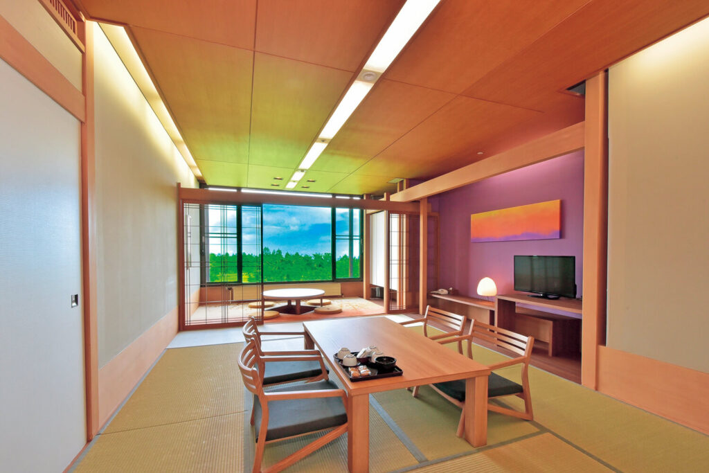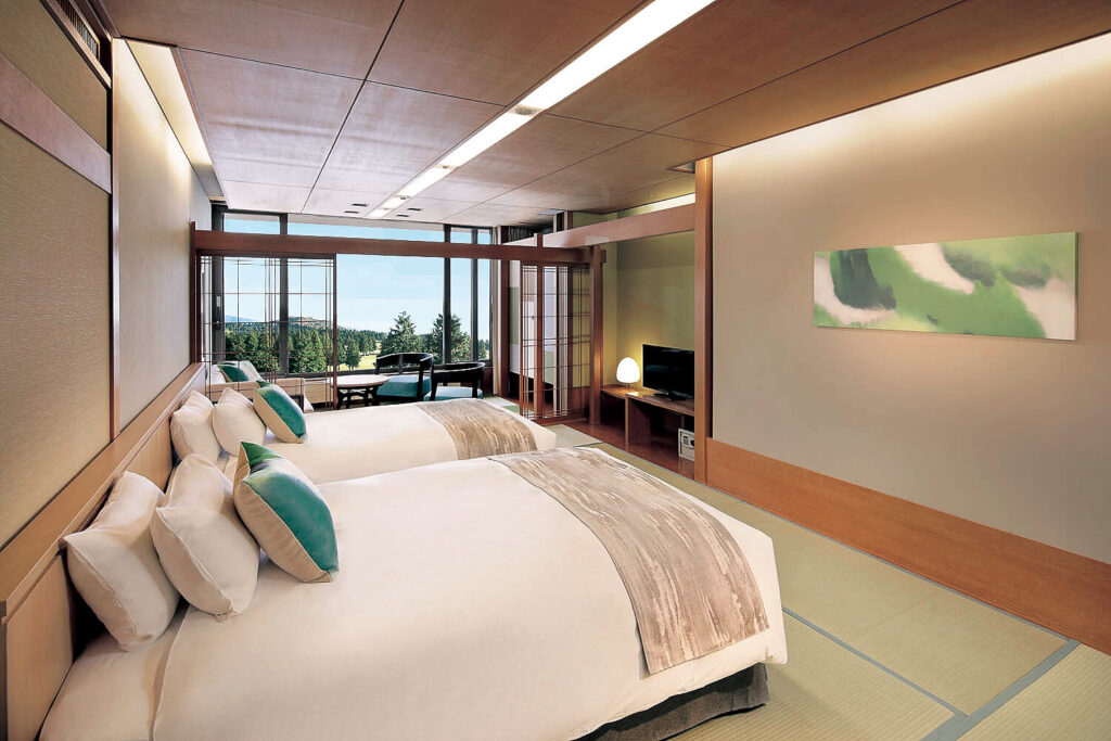 ゴルフ場を見渡せる客室は畳の香りが心地よい和室が中心で、浴衣でくつろぎながら過ごせます。最上階(4F)のお部屋からは、遠く相模湾や三浦半島、都心部の夜景までも見渡すことができます。