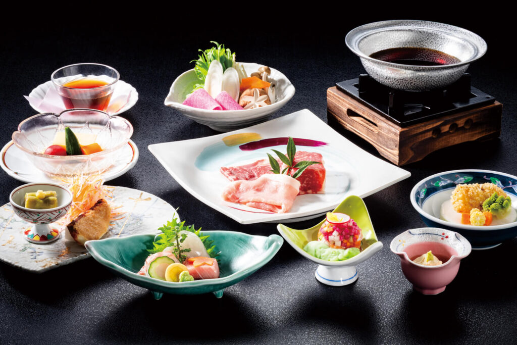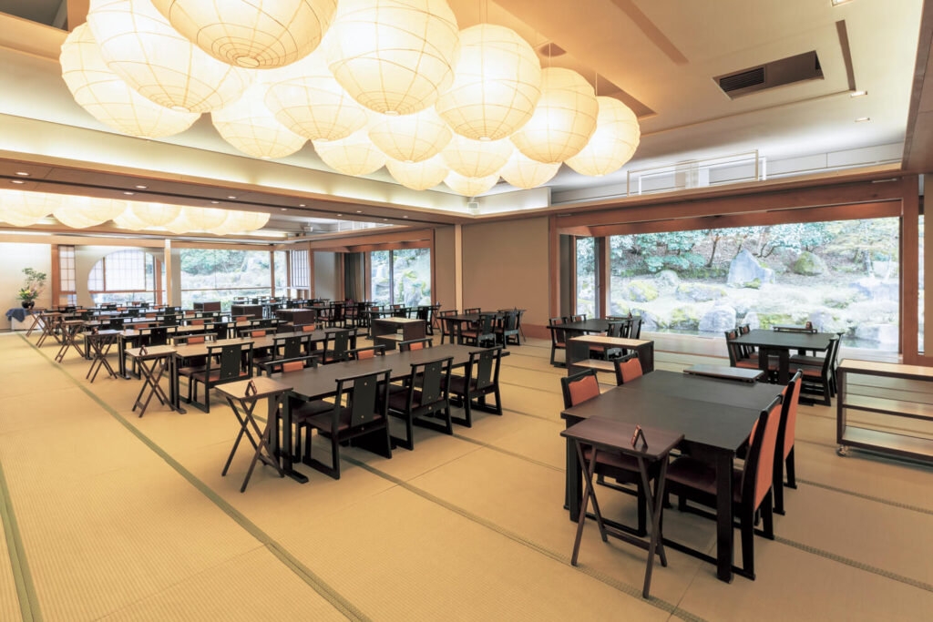 日本庭園の景色が広がるお食事処では、会席料理を落ち着いた雰囲気の中で味わうことができます。