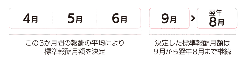 標準報酬月額は、年1回、その年の4月、5月、6月の3か月間の報酬をもとに、7月1日現在で決め直されます。決定した「標準報酬月額」は、その年の9月分の保険料(10月分給与から控除)から翌年の8月分まで使われます。