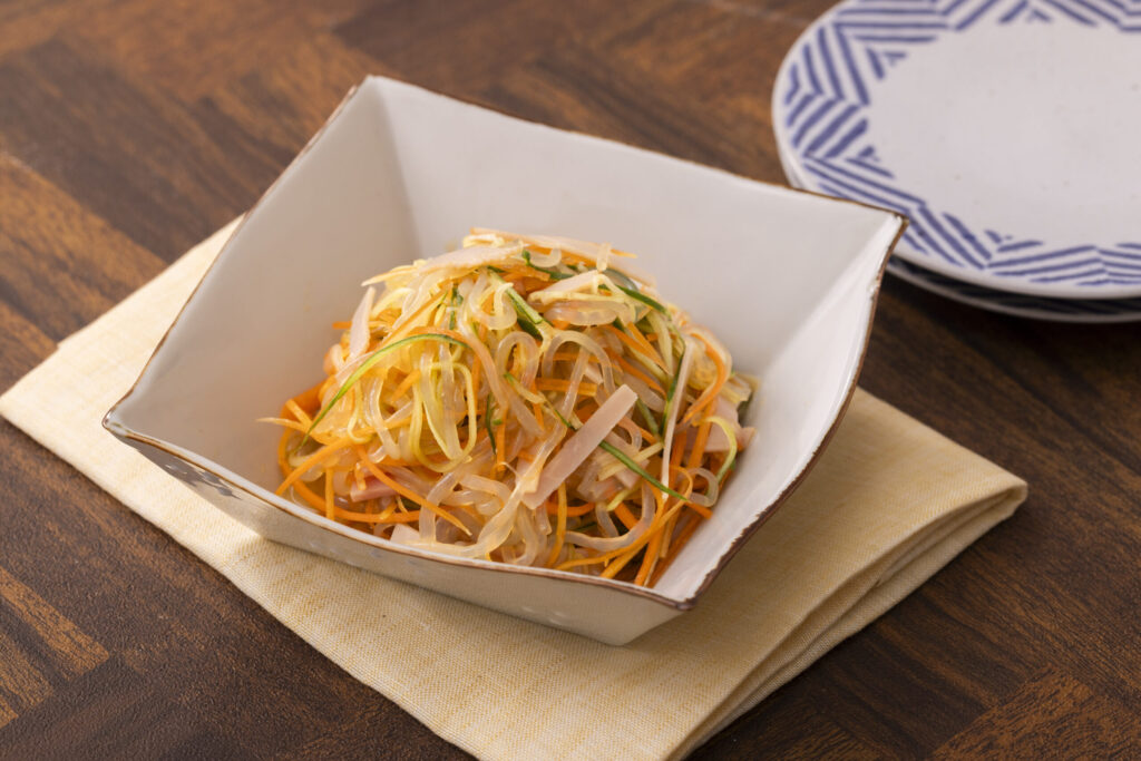 - きゅうりとにんじんは千切りに、ハムは細切りにする。