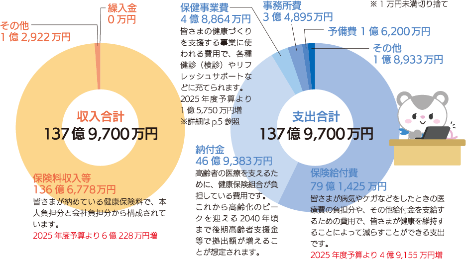 昨年度を上回る平均標準報酬月額(384,000円)により、 137億9,700万円の収入支出予算
